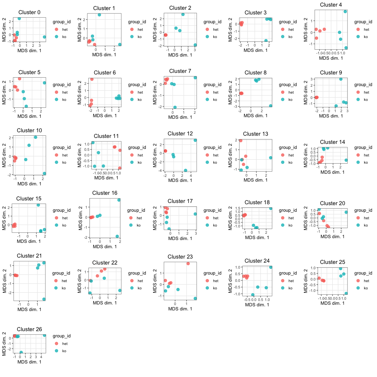 Similar to a PCA plot, the MDS allows us to visulize the distances between samples for each cluster. Ideally we'd like "het" samples to segregate together and "ko" together.